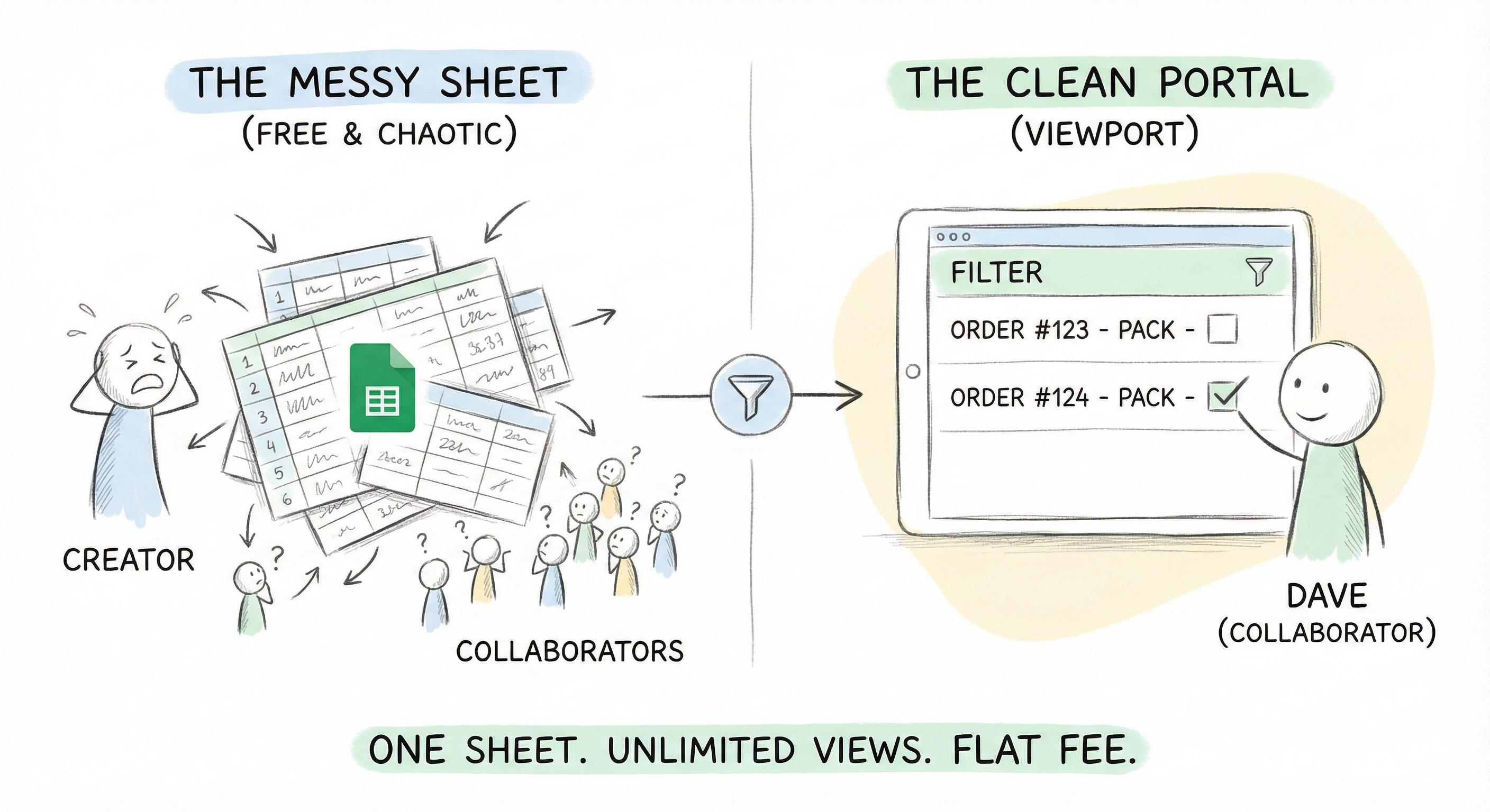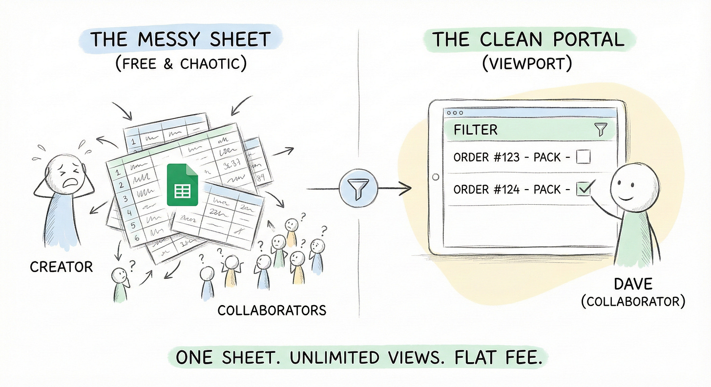 To give his 20 packers the ability to see a list and check a box, he’d need 21 paid seats. At $20/month a pop, that’s over $400. Every single month. For a job he’s currently doing with a free, if clumsy, spreadsheet.